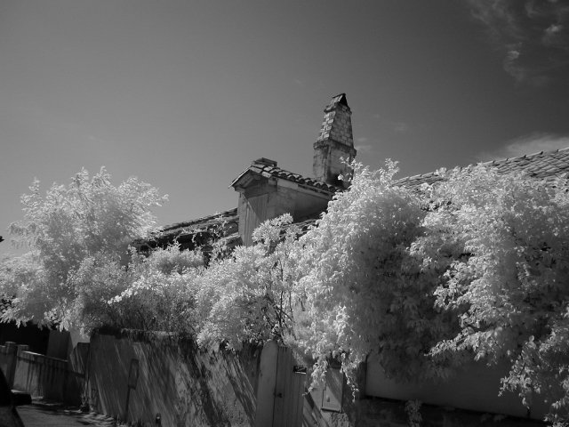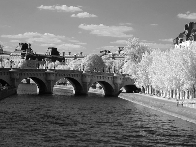 An Infrared filter on a camera will make greenery appear white, and increase cloud contrast often making the blue sky black.