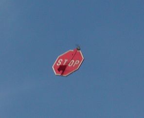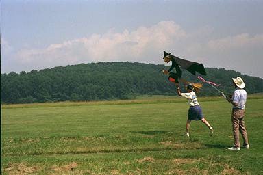 Here are some pictures of my buddy Joe's flying witch. She is lifesize and it is quite eerie to see her flying around with her cape flapping in the breeze. If you click on the first thumbnail below, you will see a propeller at the tip of her broomstick. The cape is black cloth on three spars and the broom "bristles" are really a rudder and elevator.