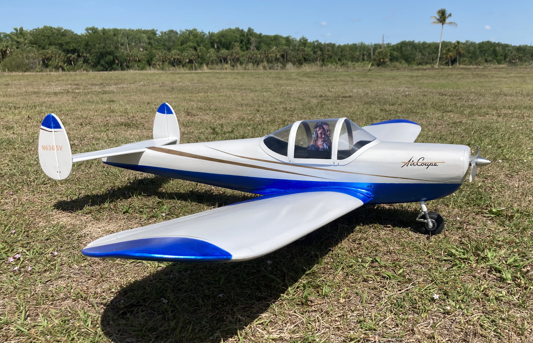 Ercoupe/Aircoupe, from Jack Stafford plans. In the 40's, this airplane was advertised as spinproof and like driving a car. The model has the same rudder system as the full-scale.