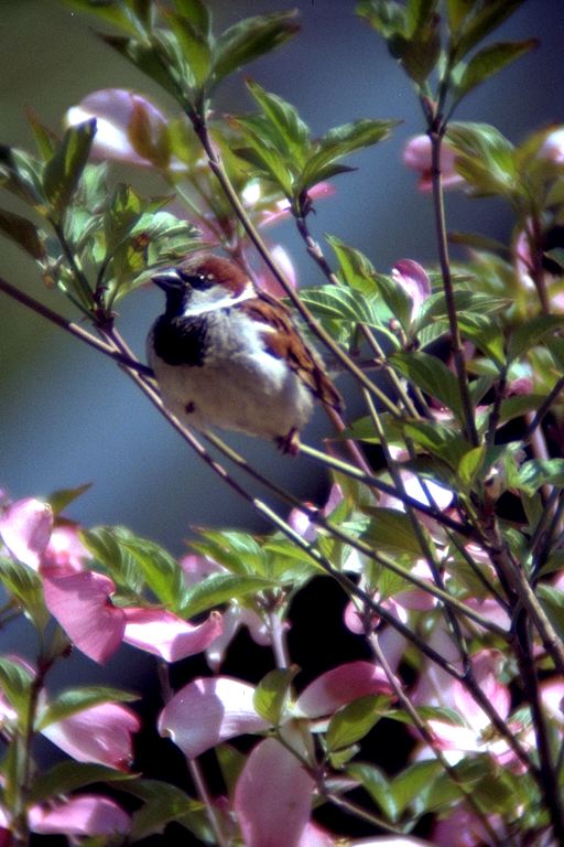 House Finches and a House Sparrow on a flowering Dogwood