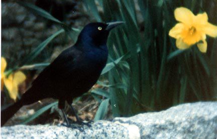 A grackle, a sparrow and some daffodils |