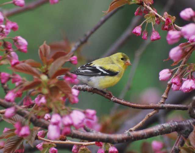 Goldfinches in a flowering cherry tree.